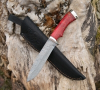 Нож Олимп из дамасской стали, рукоять - стабилизированная карельская береза, кожаный чехол в комплекте.