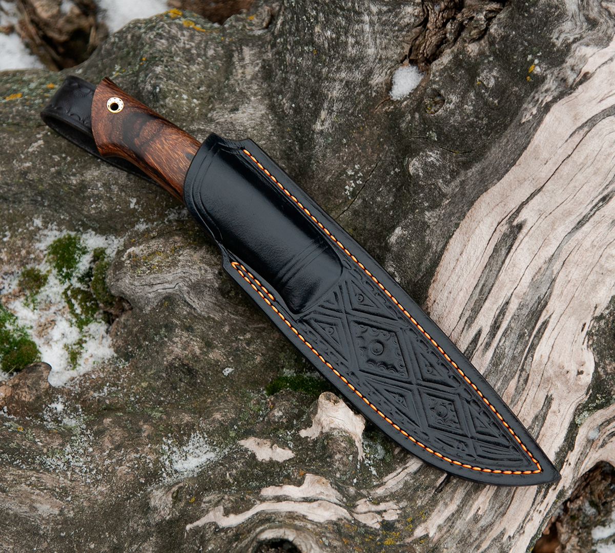 Нож Ладья из мозаичной дамасской стали, рукоять - айронвуд, стабилизированный зуб мамонта. Формованный чехол идет в комплекте.