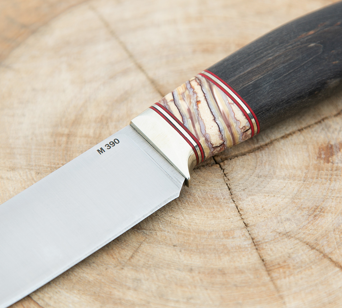 Нож Тайфун из порошковой стали М390, рукоять - стабилизированная карельская береза, зуб мамонта.