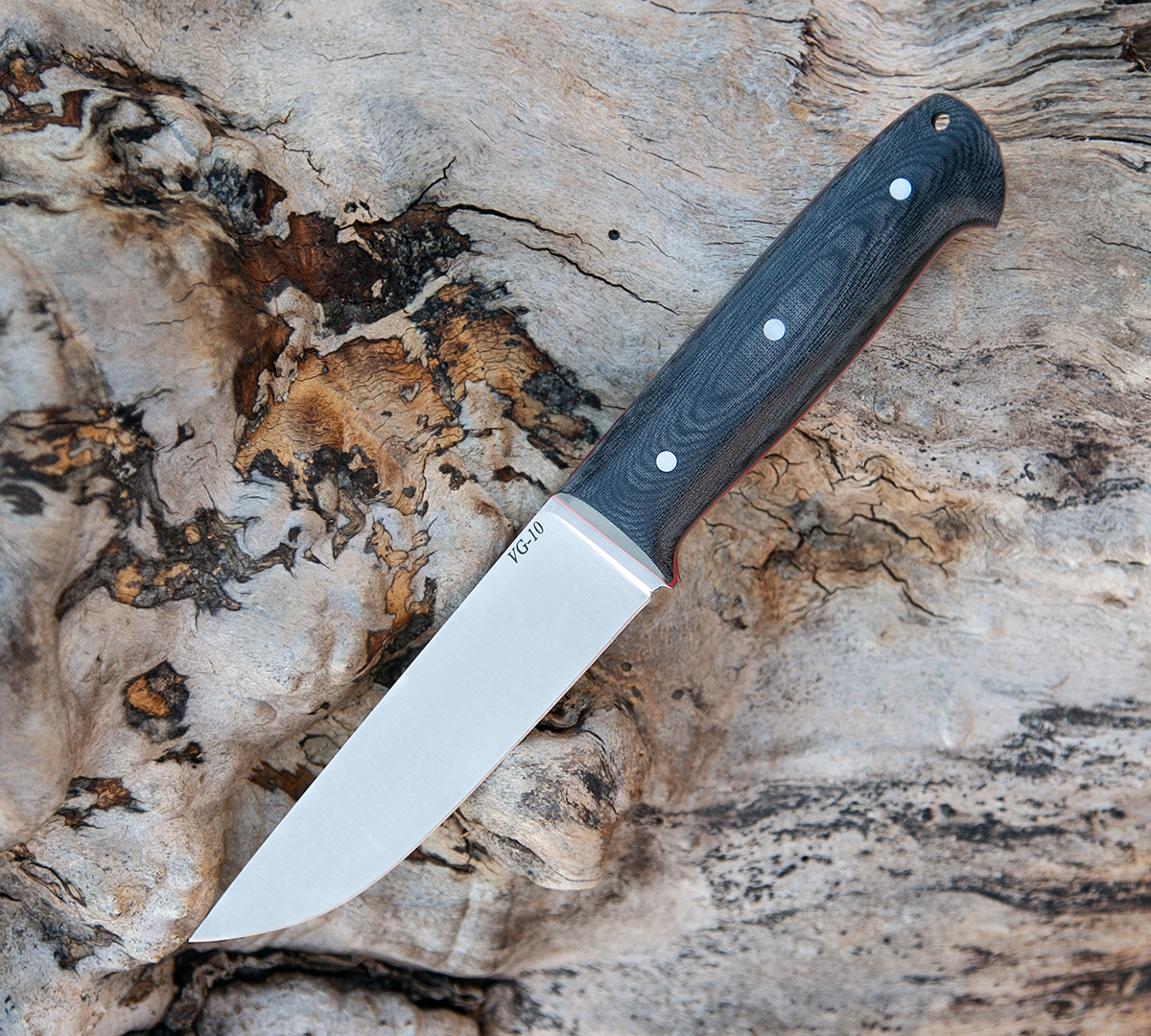Цельнометаллический нож Ладья из нержавеющей стали VG-10, рукоять - G10. Кожаный чехол в комплекте (может отличаться от фото)